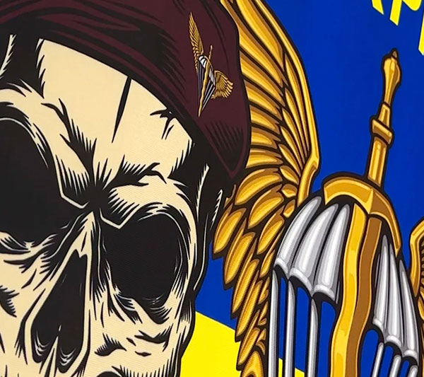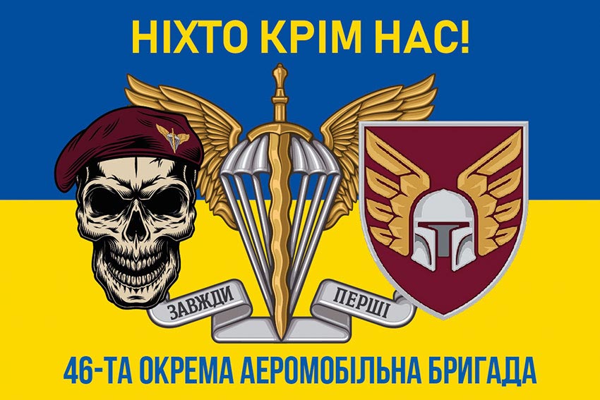 Прапор 46 ОАеМБр (окремої аеромобільної бригади) ДШВ ЗСУ синьо-жовтий «Ніхто крім нас!»